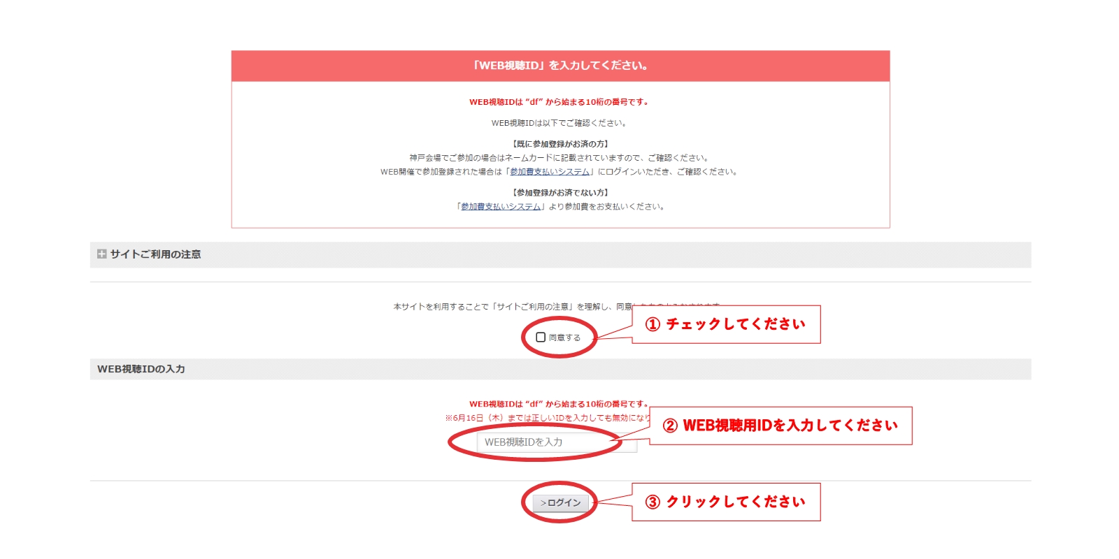 初回視聴時にはWEB視聴用IDの入力が求められます。入力後はログイン状態が保持されます。2回目以降はIDの入力無しで継続視聴が可能です。