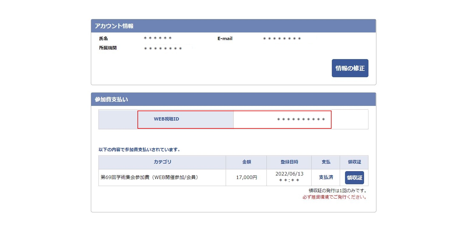 「参加費支払いシステム」の支払い状況確認画面よりご確認いただけます。